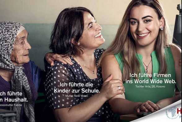 Në qytete të ndryshme në Zvicër këto ditë mund ta hasni edhe këtë fotografi, që paraqitet në formë pllakati elektronik në ekrane të vendosura në sheshe qytetesh dhe më shpesh në stacione trenash. Aty prezantohen tri gra shqiptare nga Kosova, përfaqësuese të tri gjeneratave: gjyshja, Fatimja, nëna Nolja dhe mbesa Arta, shkruan albinfo.ch. Ajo çfarë përfaqësojnë gratë në fjalë kuptohet vetëm pasi të kemi parë videon të cilën e gjejmë nën linkun e paraqitur në pllakat.