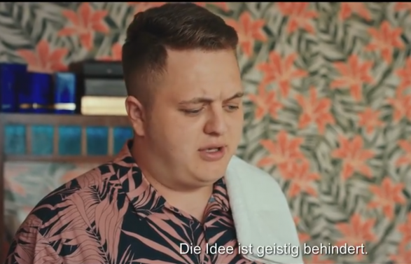 Kjo fjali është menduar si një batutë e mirë që do të sillte të qeshura të publikut, përcjell albinfo.ch. Por, para se të arrijë te publiku në sallat e kinemasë (më 12 tetor është premiera), ajo ka shkaktuar nervozë te zëdhënësja e Pro Infirmis, Susane Stahel.