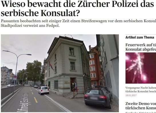 Ndërkaq Tages Anzeiger për të gjetur arsyen e masave shtesë para Konsullatës së Serbisë, i referohet shtypit serb i cili bën të ditur se një ngritje e nivelit të sigurisë është bërë edhe në përfaqësitë serbe në Bruksel, Itali, Turqi, Greqi, SHBA dhe Gjermani. Dhe kjo shpjegohet me reagimet e mundshme të shqiptarëve të indinjuar nga arrestimi i Ramush Haradinajt.