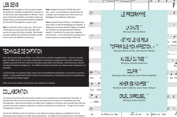 Dans le cadre du projet « Sons de Babel », l’orchestre Grand Eustache et l’Ensemble Vocale de Lausanne font également honneur à la langue albanaise. Comme nous le font savoir les organisateurs « dans les bus, sur les trottoirs, dans les cafés, dans les parcs, nous surprenons de plus en plus de conversations aux sonorités syncopées, chantantes, dynamiques, foisonnantes. Des mondes acoustiques nouveaux nous environnent, charriés par des foules en marche ».
