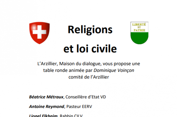 L’Arzillier, Maison du dialogue, a le plaisir de vous inviter à une table ronde sur le thème suivant : « Religions et loi civile ». Celle-ci aura lieu le 14 septembre 2017 à 19h, à Rumine 62, 1005 Lausanne.