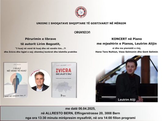 Në emër të kryesisë së Unionit të Shoqatave Shqiptare të Gostivarit në Mërgim, Ju ftojmë të merrni pjesë në përurimin e librave të autorit Lirim Begzatit, “I huaj në vend të huaj dhe në vendin tim…?!” dhe “Zvicra dhe ligjet e saj; shembuj konkret dhe këshilla praktike” si dhe në
