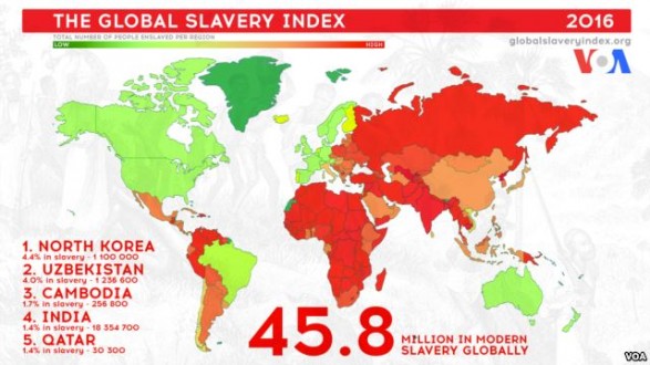 Shumica e njerëzve në kushtet e skllavërisë jetojnë në Indi dhe Uzbekistan. Qytetarët e Uzbekistanit janë më shumë të viktimizuar nga puna e detyruar – kryesisht në mbledhjen e pambukut, shkruan VoA, përcjell albinfo.ch