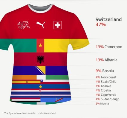 Sipas grafikës së paraqitur nga ‘swissinfo.ch’, 13 % kanë rrënjë shqiptare dhe 4 % nga Kosova, që do të thotë se 17 % janë shqiptarë. Valon Behrami dhe Xherdan Shaqiri kanë lindur në Kosovë për të emigruar në Zvicër, Granit Xhaka ka lindur në Zvicër, derisa Blerim Xhemaili ka lindur në Tetovë për të shkuar në Zvicër, transmeton tutje albinfo.ch.