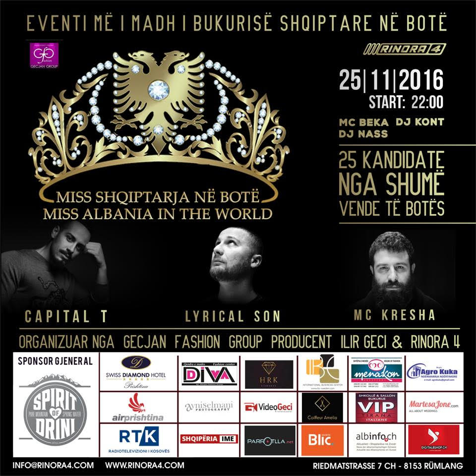 Kanë mbetur edhe pak ditë deri në finalen e madhe të spektaklit “Miss shqiptarja në botë” e cila do të mbahet në Zvicër. Të premten, 25 vajza nga gjitha trojet dhe diaspora shqiptare do të ngjiten në skenë për të garuar për kurorën e më të bukurës shqiptare në botë. Ky spektakël bukurie mbahet nën organizimin e “Gecjan Grup” dhe “Rinora 4”, ndërsa finalja do të mbahet në diskotekën e njohur shqiptare në Zvicër, “Rinora 4”, me fillim në orën 22.00.