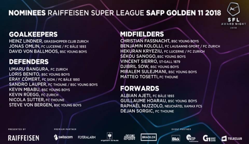 Tre futbollistë shqiptarë janë të nominuar për në formacionin “SAFP Golden 11” në Super Ligën e Zvicrës për vitin 2018, njofton albinfo.ch.