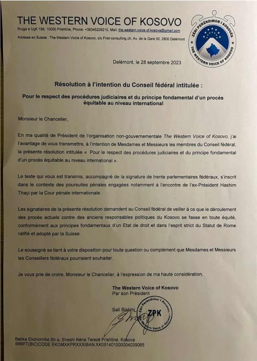 KosovaPress raporton se veprimtari Sali Bislimi do ta dorëzojë rezolutën nesër në orën 11:00 në Gjykatën Speciale. Deputetët zviceranë kërkojnë që gjykata të veprojë me paanshmëri dhe drejtësi të plotë.