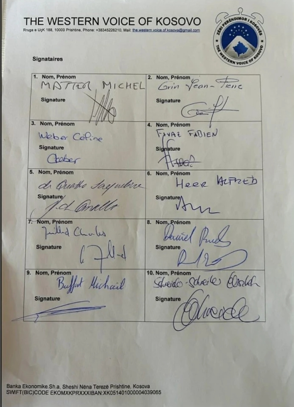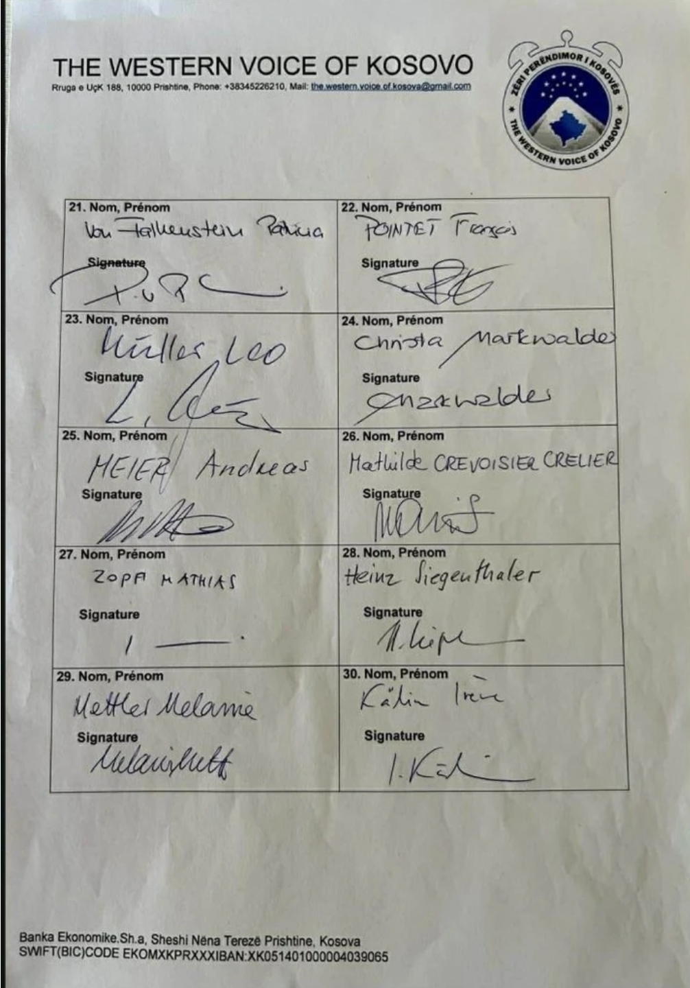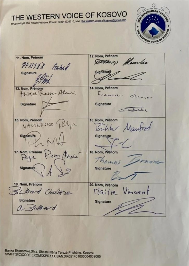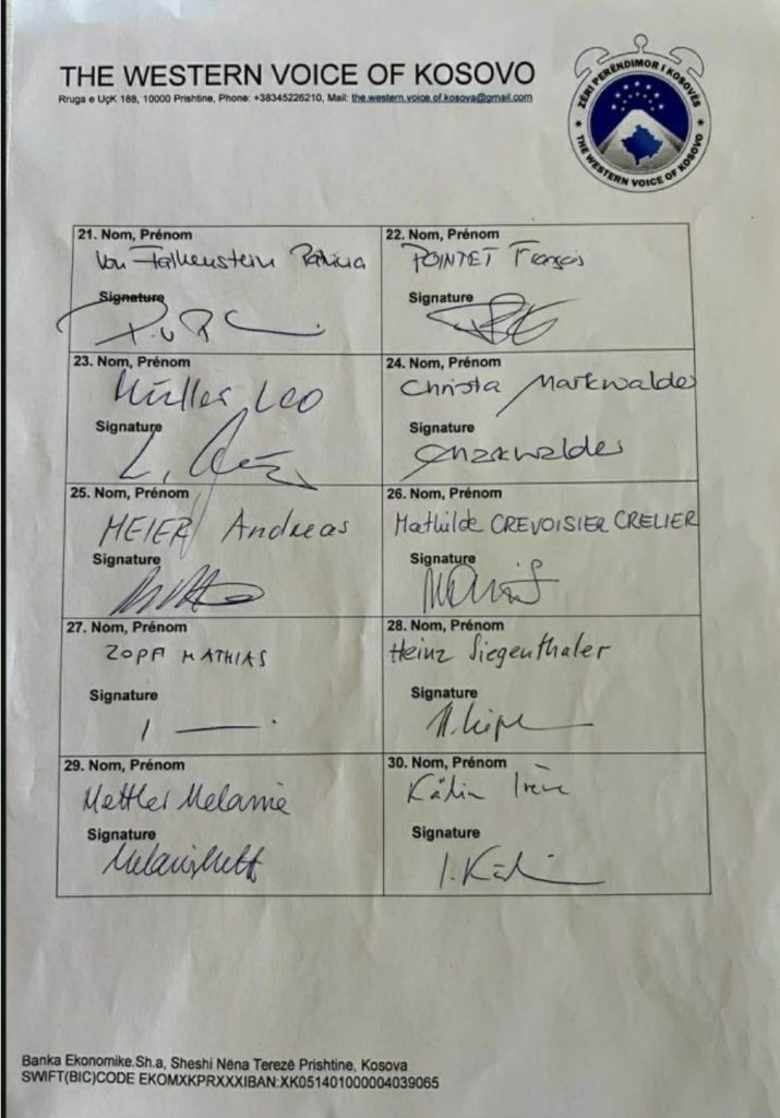 Në vijim është lista e plotë e 30 deputetëve zviceranë që kanë dhënë nënshkrimin e tyre.