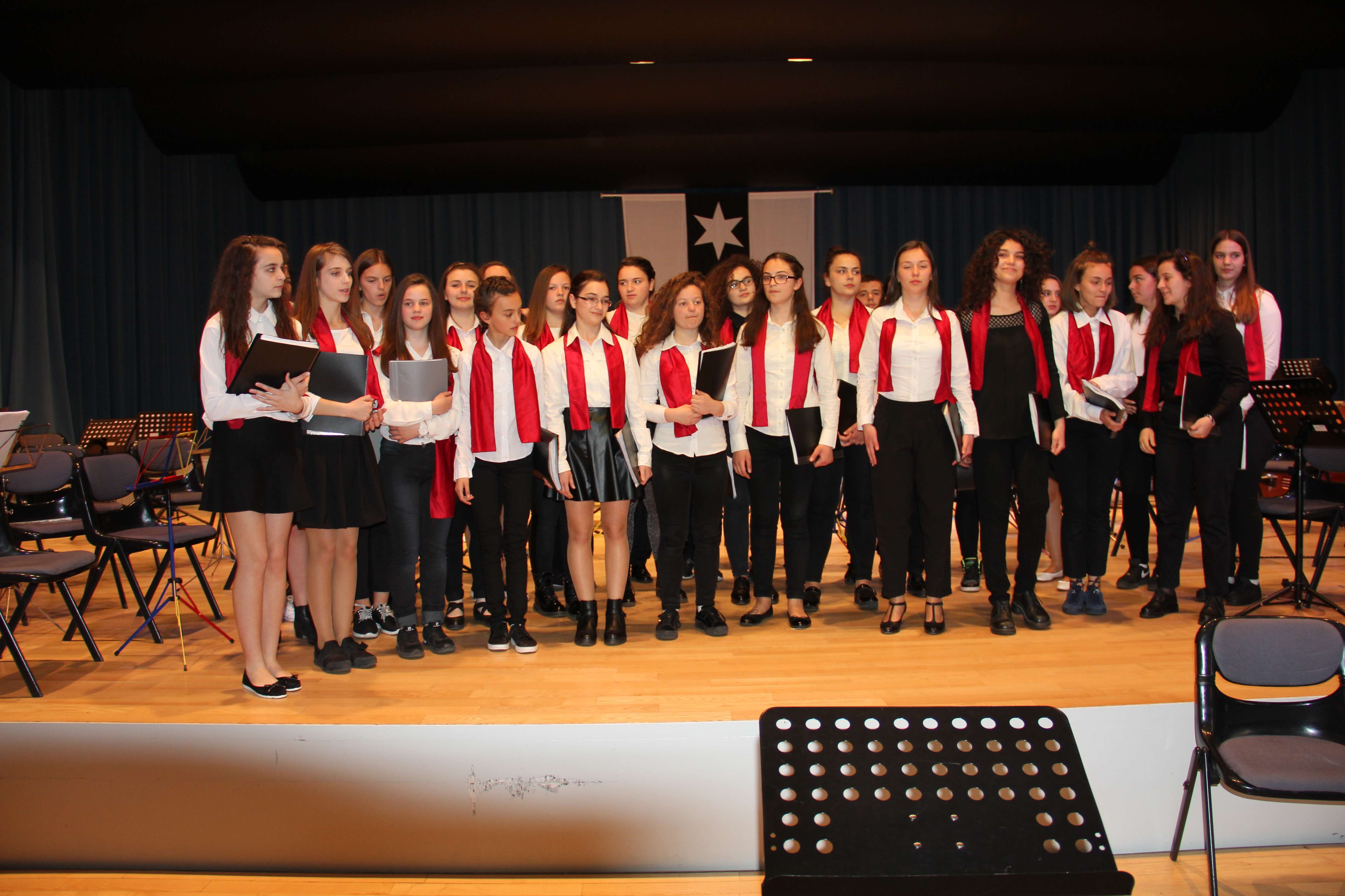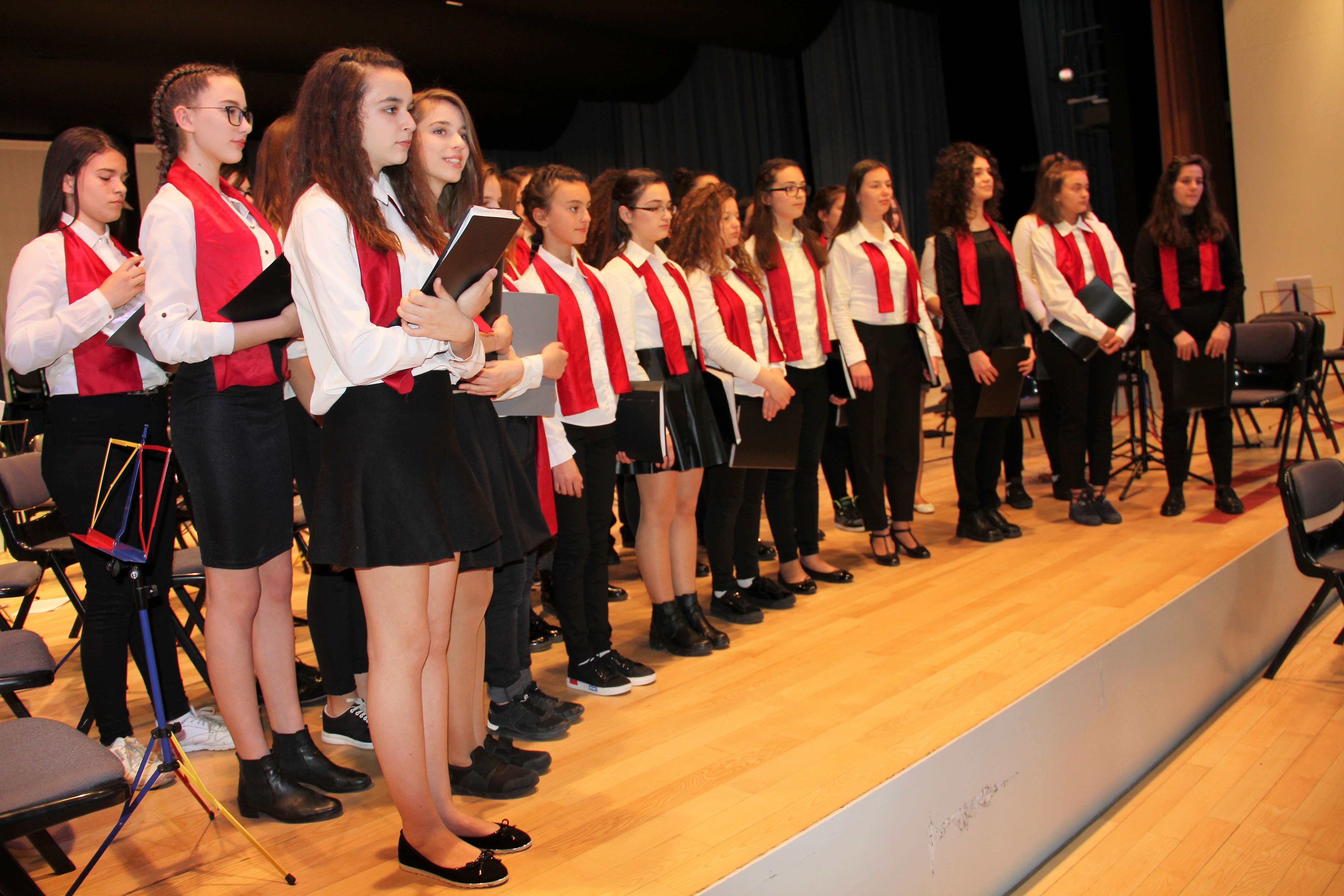 “Dua mëngjeset e majit” është kënga e parë korale me të cilën paraqiten koristët nën dirigjimin e Astrit Pallaskës. Pastaj vijnë këngët tjera të njohura nga tradita e muzikës korale shqiptare. Në kor, ashtu sikurse dhe në orkestër janë bërë bashkë nxënësit nga të dy shkollat.