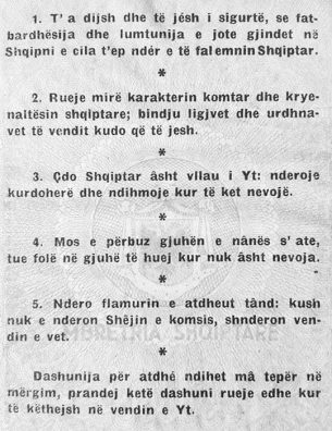 2:Ruaje mirë karakterin kombëtar dhe kryelartësinë shqiptare; bindju lidhjeve dhe urdhërave të vendit kudo që të jesh.