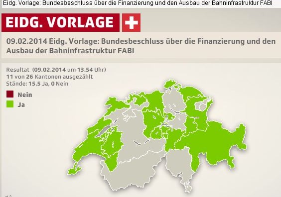 62 për qind e votuesve ka thënë Po në kutitë e votimit në referendumin e si dielës .Iniciativa rregullon financimin e ardhshëm dhe zgjerimin e infrastrukturës hekurudhore .