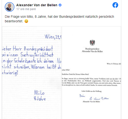 Faleminderit shumë për letrën e mirë. Pse është “e vështir? Epo, paraardhësit e mi emigruan nga Holanda rreth vitit 1700. Dhe, atje emra si Van der Bellen ose Van der Veen janë emra krejtësisht normalë, nuk janë të pazakontë. Por, nëse është shumë e ndërlikuar për ju, thjesht shkruani Sascha. Kështu më thërrasin miqtë e mi”, ia ktheu presidenti.
