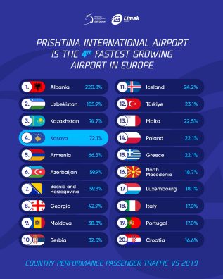 Raporti i fundit i ACI Europe e ka vlerësuar Aeroportin Ndërkombëtar të Prishtinës, “Adem Jashari”, si një nga aeroportet me rritjen më të shpejtë në Evropë, me një rritje prej 72.1% krahasuar me vitin 2019.