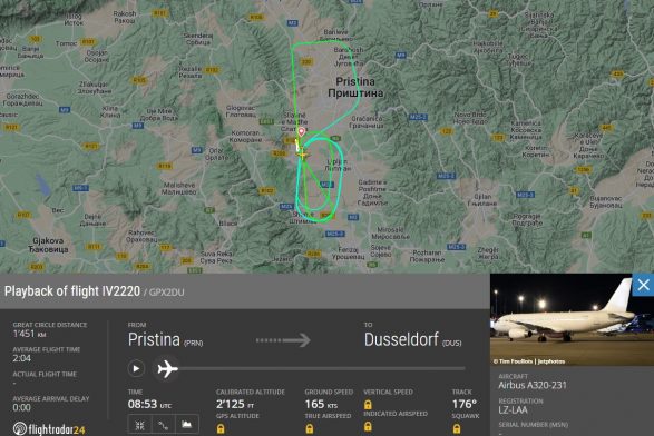 Aeroplani Airbus A320-231, i kompanisë GP-Aviation, pas 32 minutash rrotullimesh mbi Aeroportin Ndërkombëtar të Prishtinës `’Adem Jashari”, ka ateruar në pistën nga ku ishte nisur, duke anuluar kështu fluturimin për në Dusseldorf me aeroplanin që ishte goditur nga një zog. Mirëpo, siç merret vesh nga drejtuesit e kompanisë, pasagjerët kanë vazhduar fluturimin me një vonesë të shkurtër me një aeroplan tjetër të kompanisë në drejtim të Düsseldorfit.