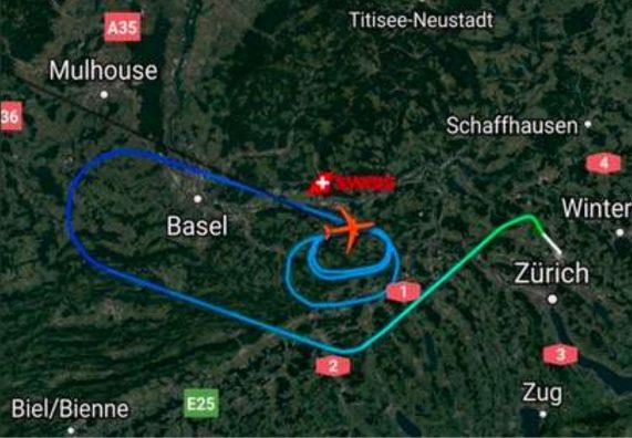 Gjatë këtyre pesë orëve të ankthshme për 220 pasagjerët dhe 12 pjesëtarët e personelit, fluturakja ka përshkuar disa herë një hapësirë të gjerë ajrore, mbi Gjermaninë Jugore, pastaj mbi Bazel, mbi Kantonin Aargau për të mbërritur deri në hapësirën ajrore mbi Mynih.