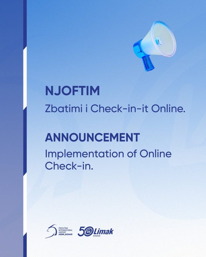 Aeroporti Ndërkombëtar i Prishtinës, Adem Jashari, ka dalë me njoftim për zbatimin e check-in-it online.