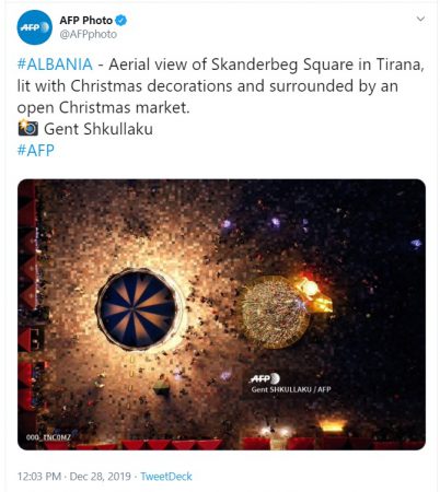 “Pamje ajrore e Sheshit Skënderbej në Tiranë, e ndezur me dekorimet e Krishtlindjes dhe e rrethuar nga një treg i hapur i Krishtlindjeve”, thuhet në tekstin e AFP-së, e cila ka miliona ndjekës nga e gjithë bota, përcjell albinfo.ch.