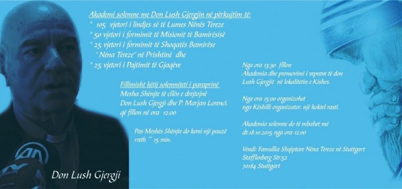 Për të nderuar disa përvjetorë, ndër të cilët kryesori ai i 105 vjetorit të lindjes së Nënë Terezës, më 18 tetor në famullinë shqiptare “Nënë Tereza” në Stuttgart mbahet një akademi solemne me Don Lush Gjergjin.
