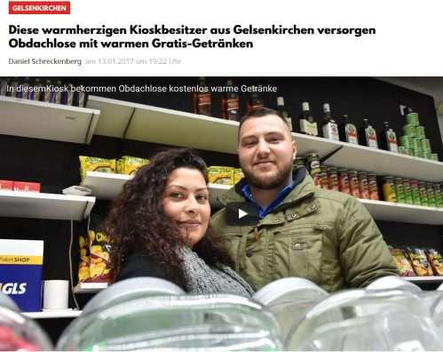 Alban Ferati, një shqiptar 21 vjeçar me prejardhje nga Kosova, së bashku me të shoqen, Birgül është pronar i një kioske në qytetin Gelsenkirchen, shkruan derwesten.de. Javën e kaluar ai u ishte drejtuar përmes facebook-ut të gjithë bashkëqytetarëve me një lutje jo të zakonshme: “Ju lus të gjithë që, nëse shihni rrugës njerëz që nuk janë në gjendje të mirë, i sillni te unë, në kioskë. Pijet e ngrohta janë pa pagesë për të gjithë ata që kanë nevojë”, transmeton albinfo.ch