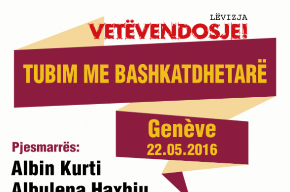 Programi i takimeve (Në pika të shkurta): Zürich : 19 Maj – Takim me shoqatën e studentëve të St-Gallenit: 20 Maj – Takim me shoqatën e studentëve. (Albin Kurti) Lausanne : Të shtunën 21 maj 2016, ora 18:00, Club Alpin Suisse, Rue Charles Monnard 6 – 1003 Lausanne. Genève : Të dielën 22 maj 2016, ora 13:30, SALL DES FÊTES DES AVANCHETS, Rue François–Durafour 17 – 1220 Avanchets. Zürich: Të dielën 22 maj 2016, ora 19:00, Volkshaus, Weisser Saal, Stauffacherstrasse 60 – 8004 Zürich