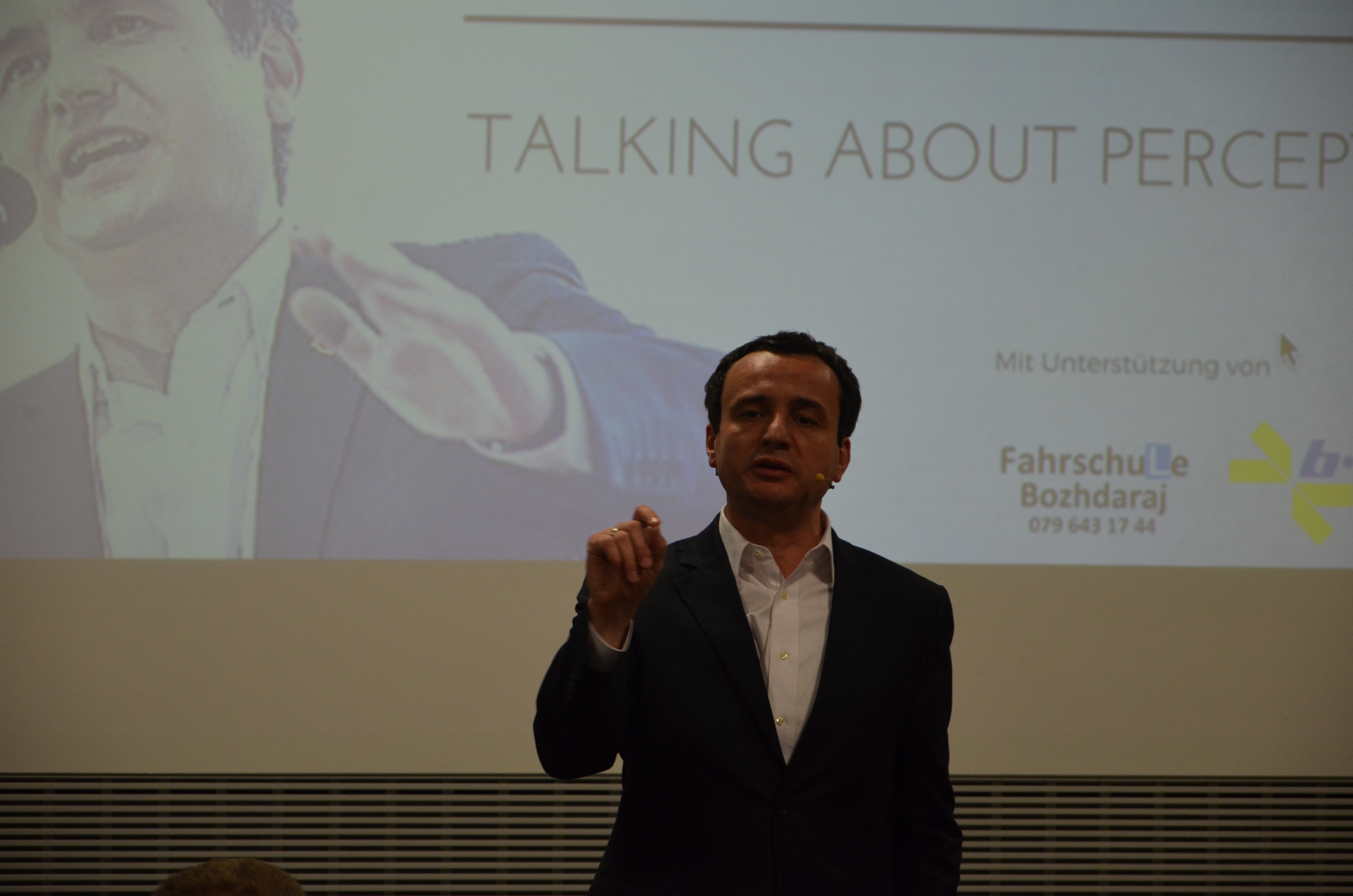 Kurti që foli në pjesën më të madhe të paraqitjes së tij mbi jetën e tij studentore, vuajtjet në burgjet serbe dhe angazhimi i tij politik në Kosovën e pasluftës, themelimin e Lëvizjes Vetëvendosje, situatën e jetën në Kosovë, nuk la anash as kontriboutin e mërgatës shqiptare të Zvicrës.