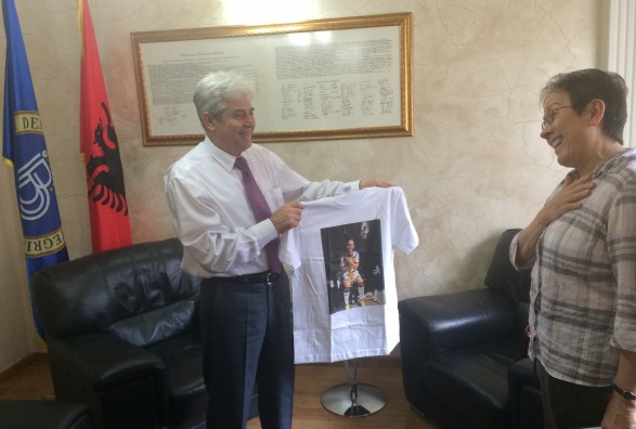 Lideri i BDI- së ia dhuroi ambasadores Shtajnaker një fanellë të veçantë me fotografinë e lojtarit me prejardhje shqiptare në kombëtaren gjermane, Shkodran Mustafi, me gjestikulacionin e shqiponjës dy krenare, fotografi kjo e bërë menjëherë pas shpalljes kampion bote.