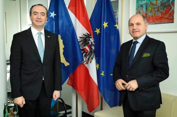 “ Ambasadori i Republikës së Kosovës, Lulzim Pllana u prit nga kryetari i Këshillit Nacional/ Parlamentit austriak zt. Wolfgang Sobotka. Gjatë takimit është diskutuar gjendja aktuale e situatës me Covid19 si dhe bashkëpunimi i mëtutjeshëm Kosovë-Austri. Për shkak të masave të parandalimit të covid19 është respektuar masa e distancës”.