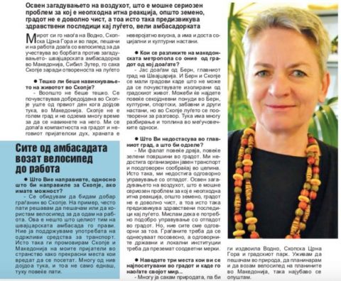Ambasadorja e Zvicrës në Maqedoni, Sibil Zuter, qetësinë e gjen në Vodno, Karadakun e Shkupit dhe në park, ecje, në punë vjen me biçikletë për të luftuar kundër ndotjes së ajrit, informon albinfo.ch.