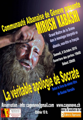 Këtë të shtunë, më 8 tetor në Gjenevë jepet shfaqja shumë e njohur e aktorit të shquar shqiptar Mirush Kabashi “Apologjia e vüërtetë e Sokratit”. Shfaqjen e mundëson Komuniteti Shqiptar i Gjenevës.