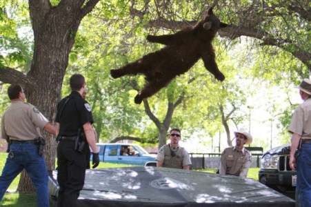 Vetëm pak pas kësaj, ariu, ashtu siç e tregon edhe kjo fotografi, duke iu nënshtruar ligjit të gravitetit, ka rënë nga pema. Rojtarët janë kujdesur që ai ta ketë butë dhe të mos pësojë nga kjo rënie.