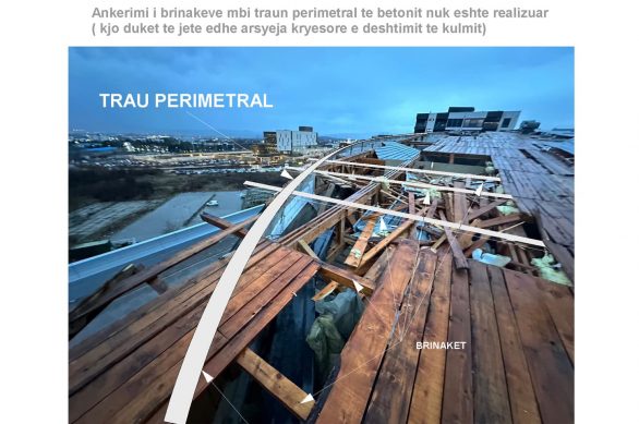 “Kulmi përgjatë perimetrit të tij ka pasur strehë. Si pasojë e erërave, presioni i krijuar nën strehën e kulmit e ka nda konstruksionin e kulmit nga muri vertikal ku kulmi ka peshuar. Pas pamjeve dhe hulumtimeve në teren kemi hasur në shumë parregullsi të ekzekutimit të punimeve në konstruksionin e kulmit”, thuhet në raport.