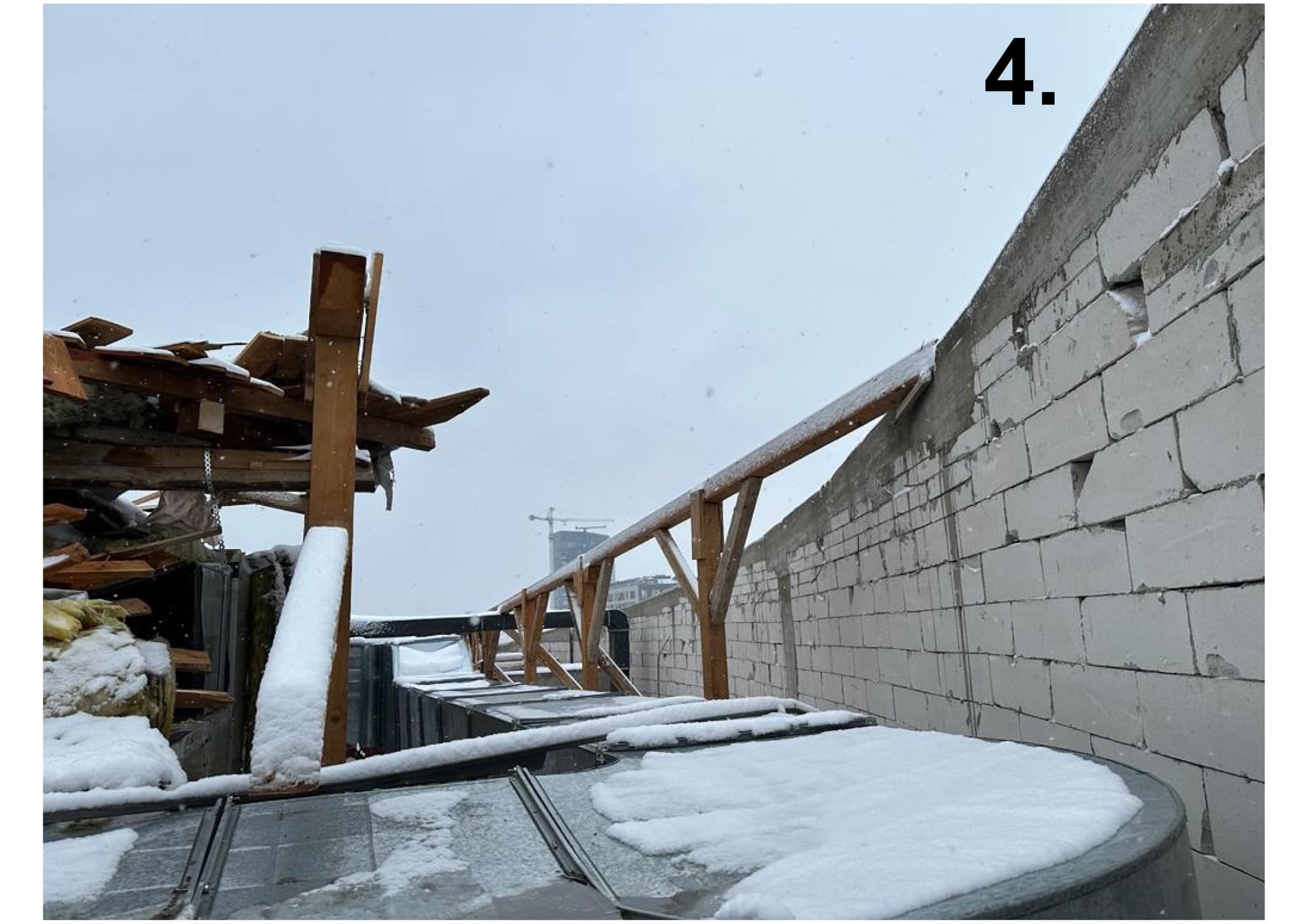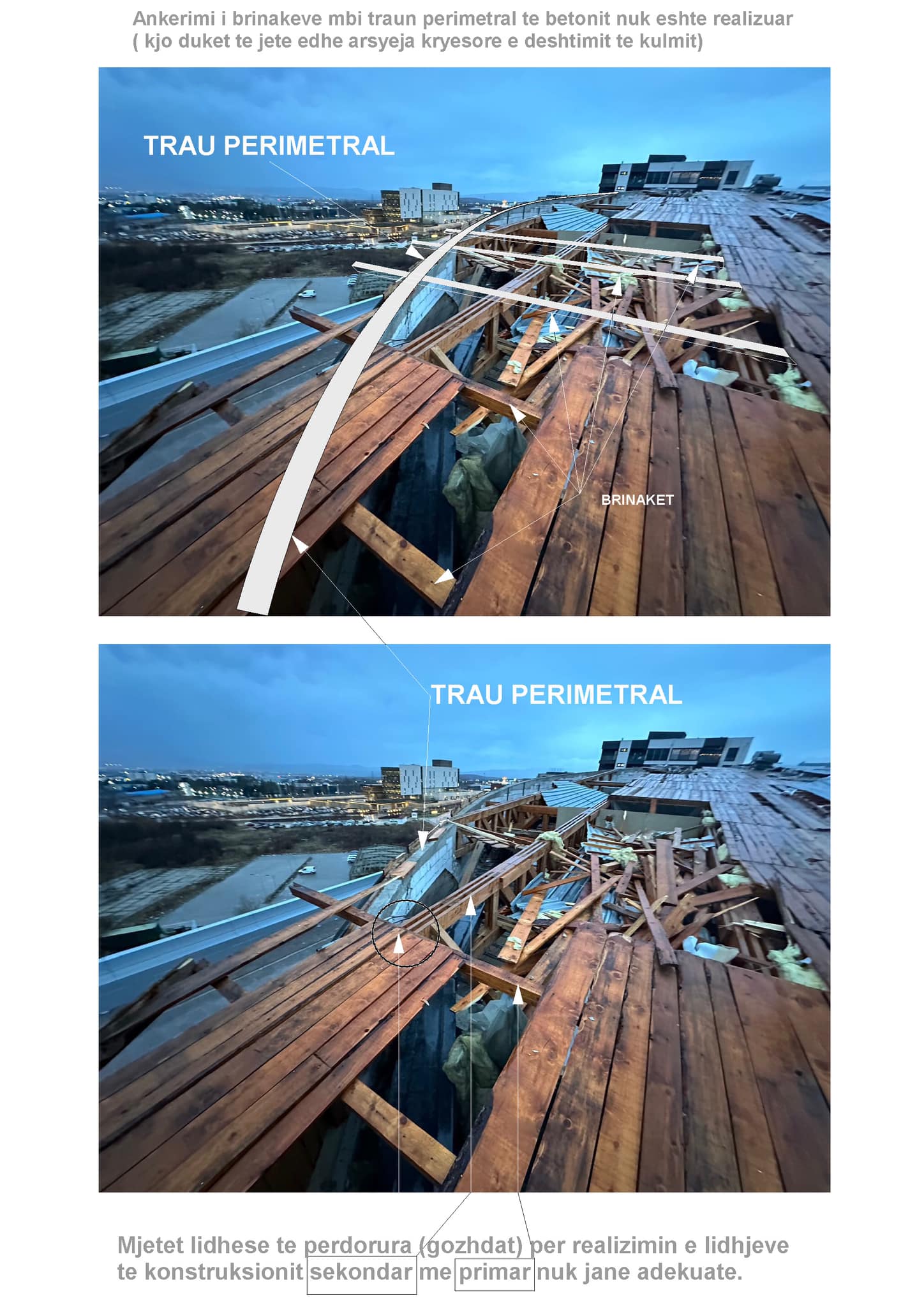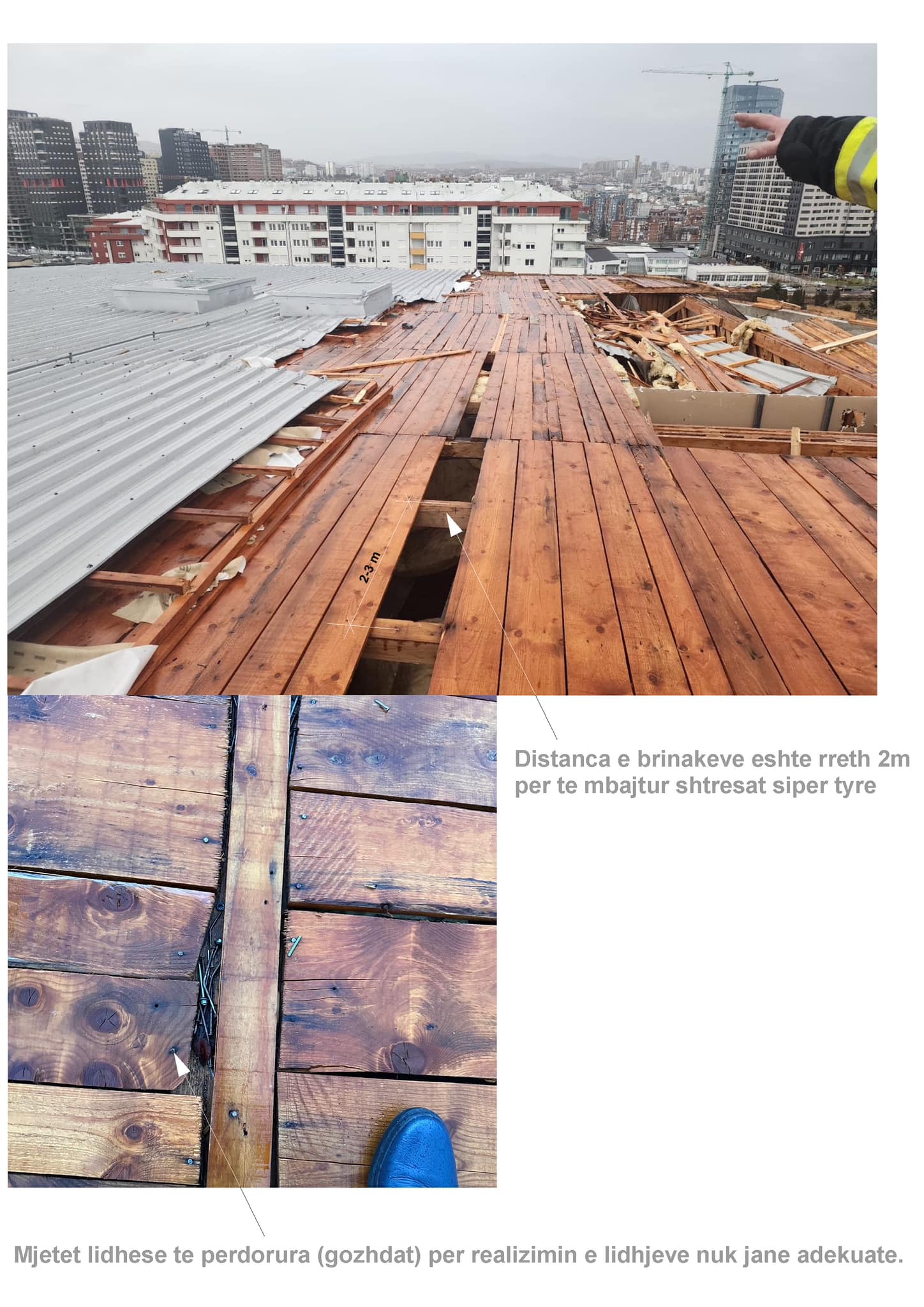 “Kulmi përgjatë perimetrit të tij ka pasur strehë. Si pasojë e erërave, presioni i krijuar nën strehën e kulmit e ka nda konstruksionin e kulmit nga muri vertikal ku kulmi ka peshuar. Pas pamjeve dhe hulumtimeve në teren kemi hasur në shumë parregullsi të ekzekutimit të punimeve në konstruksionin e kulmit”, thuhet në raport.