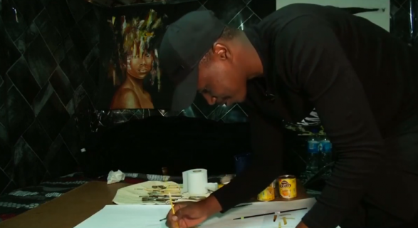 Enoh Mlangeni nuk mund të përballojë shpenzimet për blerjen e ngjyrave për pikturim, kështu që përdor kafen në vend të tyre.