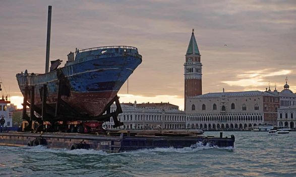 Me rrënojat e një varke në të cilën vdiqën më shumë se 700 emigrantë, një skulpturë lidhëse të duarve që formonin një urë dhe fjalët e një letre nga Gandi për Hitlerin në mesin e veprave në shfaqje, artistët po bëjnë ndryshimin e klimës në qendrën e populizmit në Bienalja e Venedikut.