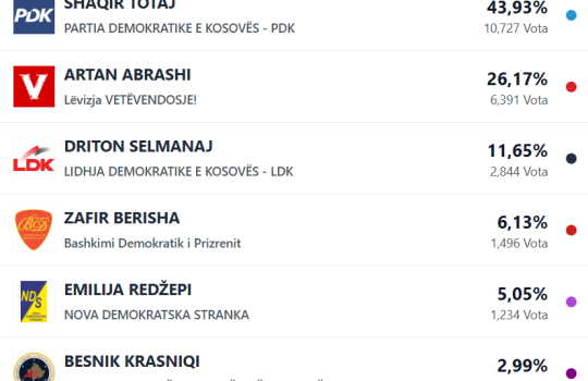 - PDK e para aktualisht në Prizren, Shaqir Totaj kryeson me 43,9 për qind të votaveRezultatet e fundit të publikuara nga Komisioni Qendror i Zgjedhjeve (KQZ)...