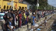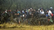 Refugjatët kalojnë telat me gjemba dhe kordonin policor