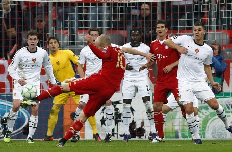 Pas një fillimi deri diku shpresëdhënës, ku FC Basel dukej se megjithatë mund t`i qëndronte përballë Bajernit, shumë shpejt filloi të bëhet e qartë se kush është favoriti në këtë ndeshje. Në minutën 11 Arjen Robben shënon golin për Bajernin. Dhe ky ishte vetëm fillimi. Me këtë gol, lojtarët e Bazelit e humbasin iniciativën por dhe guximin për të bërë depërtime drejt portës së kundërshtarit.
