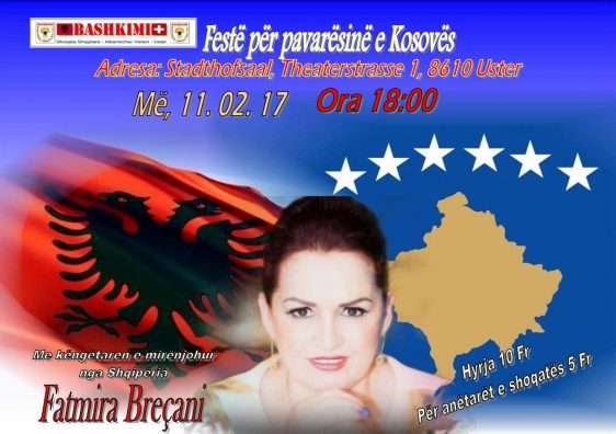 Shoqata Bashkimi ne Uster, do te organizojë nje manifesim kushtuar 9 vjetorit te pavaresise se Kosoves. Manifestimi do te jete me 11.02.17, duke filluar nga ora 18:00 ne kete adrese: Stadthofsaal, Theaterstrasse 1, 8610 Uster.