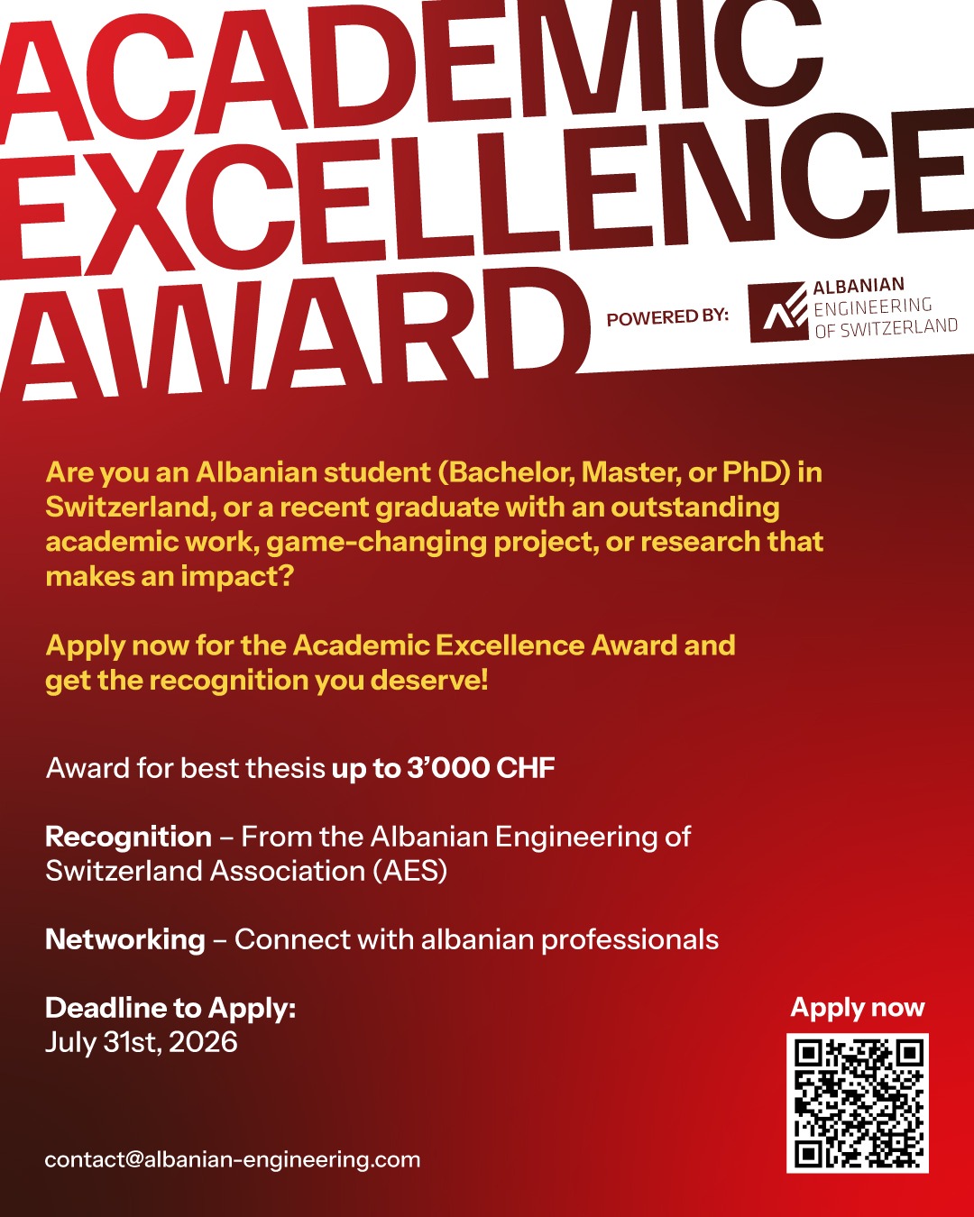 Gara për Çmimi për Përsosmëri Akademike nga Albanian Engineering of Switzerland (AES) është tashmë e hapur për aplikime!