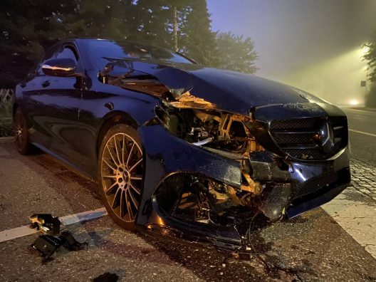 Në një kthesë të lehtë në anën e majtë, ai del nga rruga në të djathtë dhe futet në shkurret e mbjella anës së rrugës, transmeton albinfo.ch. Aty, Mercedesi u përplas në një pemë, e cila nga goditja e makinës u rrëzua përdhe. Makina, për pasojë, pësoi dëme të rënda.