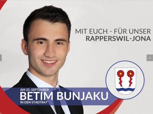 Betim Bunjaku është një i ri 27 vjeçar, i cili ka vendosur të kandidojë për një vend në Asamblenë e qytetit Rapperswil-Jona, Kantoni i St. Gallenit, në zgjedhjet që mbahen nesër, më 25 shtator. Ai është rritur në këtë qytet të bukur buzë Liqenit të Cyrihut, i cili ndryshe quhet edhe “Rosenstadt” (qyteti i trëndafilëve). Politikani i ri ka një diplomë bachelor në ekonomi, nga Universiteti i St. Gallenit ku së shpejti do të marrë edhe masterin.