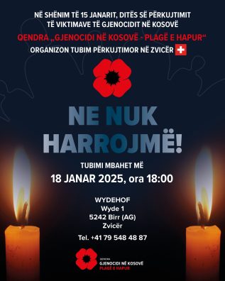 Në shënim të Ditës së Përkujtimit të Viktimave të Gjenocidit në Kosovë, Qendra “Gjenocidi në Kosovë – Plagë e Hapur” do të organizojë tubim përkujtimor në Zvicër. Tubimi do të mbahet të shtunën më 18 janar në Birr (AG) duke filluar nga ora 18:00 në këtë adresë: Wydehof Wyde 1 5242 Birr (AG) Zvicër.