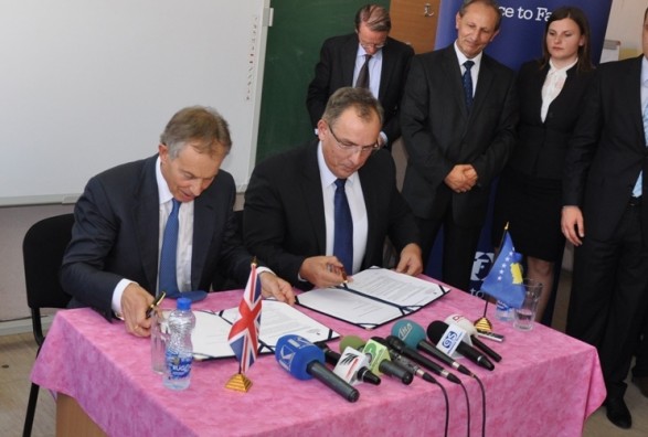 Ish-kryeministri britanik, Tony Blair dhe ministri kosovar i Arsimit, Ramë Buja nënshkruan të hënën në Prishtinë një Memorandum Bashkëpunimi ndërmjet Fondacionit “Tony Blair Faith Foundation” dhe Qeverisë së Kosovës, për hapjen e programit të shkollave globale “Face to Faith” në shkollat kosovare. Nënshkrimi i kësaj marrëveshje u bë në shkollën “Elena Gjika” në Prishtinë, ku nxënësit e kësaj shkolle, e pritën në mënyrë të veçantë, me një program artistik, mikun e madh të tyre dhe të Kosovës, Tony Blair. Ministri Buja e vlerësoi ish-kryeministrin Blair si mik të çmuar të popullit shqiptar, i cili i dha shumë pavarësisë së Kosovës. “Kur isha në Britani, i thash qytetarëve: ‘faleminderit shumë votues të Mbretërisë së Bashkuar’. Më pyetën përse. Iu thash se kam arsye shumë t’iu falënderojë, por në veçanti që botës ia dhuruat Tony Blair, nuk e mbajtët vetëm për vete si kryeministër. Andaj, ju them se Tony Blair është një mik i madh i yni”, u shpreh ministri Buja. Ish kryeministri i Mbretërisë së Bashkuar, Tony Blair, me këtë rast tha se sa më shumë që udhëtojnë njerëzit dhe i shohin pjesët tjera të botës është më mirë, por theksoi se megjithatë procesi i liberalizimit të vizave për Kosovën do të shkojë hap pas hapi. “Me të vërtetë dua ta shoh se si do të ndodhë kjo, por e dimë se duhet të shkojmë hap pas hapi dhe se kjo merr kohë. Nëse e krahasojmë gjendjen që jemi tani me atë para 10 viteve, mund të shohim se kemi bërë shumë rrugë… “, tha ai, duke premtuar ndihmë Kosovë edhe nëpërmjet fondacionit. “Do të fillojmë me tri shkollat në Kosovë dhe te Universiteti që është pjesë e këtij programi, dhe do të krijojmë lidhjet prej Kosovës me jashtë. Fondacioni ndihmon në këtë drejtim jo vetëm në Britani. Ka shkolla në SHBA, Kanada dhe në pjesë të ndryshme të lindjes së largët. Ajo që unë bëj sa herë takohem me liderë botëror, është të mbështesim Kosovën “, theksoi Blair. “Face to Faith” është një program për shkollat globale që bashkon nxënësit e moshave 12-17 vjeçare në të gjithë botën duke përdorur teknologjinë digjitale. Foundacioni “Tony Blair Faith Foundation” është duke punuar me Qeverinë e Kosovës për t’iu ofruar nxënësve kosovarë një mundësi të veçantë përmes teknologjisë, për të mësuar më shumë rreth kulturave të tjera dhe të pranojnë dhe të respektojnë tjetrin. “Face to Faith” aktualisht është aktiv në 18 vende të botës: Australi, Kanada, Egjipt, Indi, Indonezi, Izrael, Itali, Jordani, Liban, Meksikë, Pakistan, Territoret palestineze, Filipine, Singapor, Ukrain, Emiratet e Bashkuara Arabe, Britania e Madhe dhe ShBA. Shtimi i shkollave të Kosovës do të rrisë numrin në 19. Ish-kryeministri Blair u takua edhe me ministrin e jashtëm, Enver Hoxhaj dhe me ministren e Integrimit Evropian, Vlora Çitaku. Hoxhaj tha se “Blair është simbol i besimit, optimizmit dhe shpresës për qytetarët e Kosovës”.“Ne përulemi me një mirënjohje të thellë para jush për lirinë e Kosovës. Shprehim mirënjohje të madhe për qindra dhe mijëra qytetarë britanik, para shumë ushtarëve, të cilët parandaluan asgjësimin tonë fizik dhe kontribuuan aq shumë për Kosovën…”, tha Hoxhaj. Në anën tjetër, ish-kryeministri britanik Tony Blair, duke shprehur gëzimin për vizitën në Kosovën, ka vlerësuar progresin që po arrin Kosova në të gjitha fushat, duke shprehur përkrahjen e tij të mëtutjeshme.