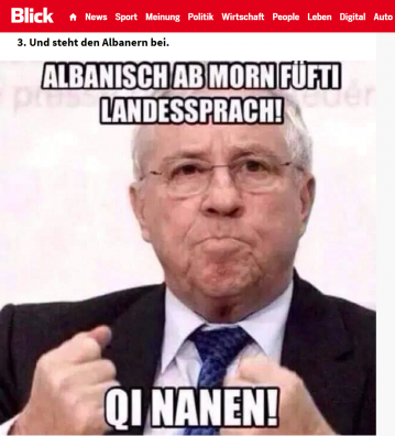 Mirëpo, e përditshmja zvicerane “Blick” e tepron kësaj radhe me sarkazmin e saj, duke publikuar një foto me ish këshilltarin federal zviceran, Christoph Blocher, i cili kinse kërkon që gjuha shqipe nga nesër të bëhet gjuha e pestë zyrtare në Zvicër me një “urdhër” për përdorimin e fjalëve banale në gjuhën shqipe, informon albinfo.ch.