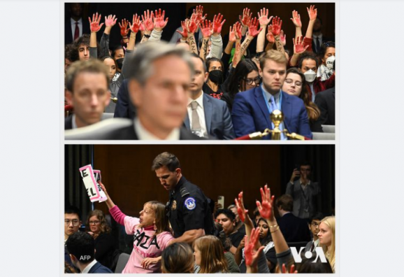 Derisa po mbahej fjalimi, një protestues çon duart lart, duke treguar duar të lyera, ndërsa Sekretari amerikan i Shtetit, Antony Blinken dhe Sekretari i Mbrojtjes, Lloyd Austin, dëshmonin gjatë një seance të Komitetit të Përshtatjeve të Senatit për të shqyrtuar kërkesën plotësuese të sigurisë kombëtare, në Capitol Hill, në Uashington, DC.