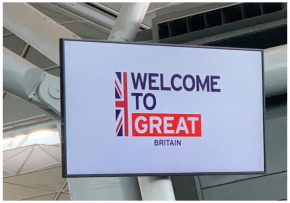 Por, një gjë vihet re në hyrjen e aeroportit të Londrës Stansted, disa tabela të vendosura pas Brexit, Mirë se rdhet në Britaninë e Shkëlqyer (Welcome to Great Britain).