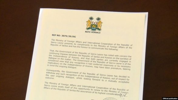 Një dokument i siguruar nga Radio Evropa e Lirë (RSE) në Ministrinë e Jashtme serbe thuhet se Qeveria e Sierra Leone ka vendosur të tërheqë njohjen e pavarësisë së Kosovës. Në dokumentin, në të cilin, megjithatë, nuk ka ndonjë nënshkrim, thuhet se Qeveria e Siera Leones po shikon me shqetësim bllokimin në marrëdhëniet midis Serbisë dhe Kosovës.