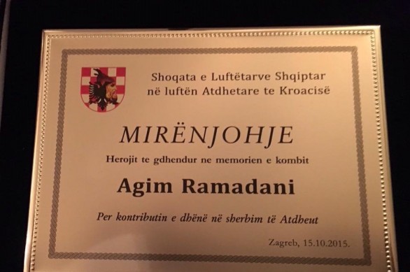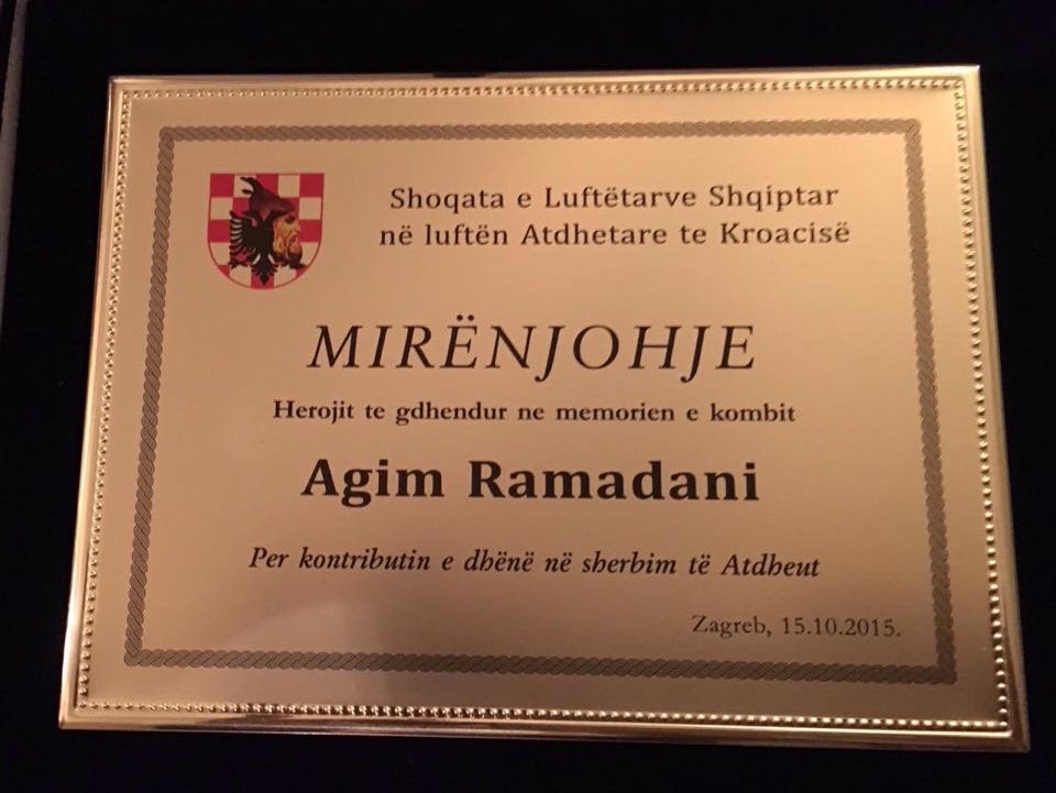 Me këtë rast edhe Shoqata e Luftëtarëve Shqiptarë në luftën atdhetare të Kroacisë, ndau një Mirënjohje të veçantë për heroin e gdhendur në memorjen e kombit, Agim Ramadanin, për kontributin e dhënë në shërbim të atdheut.