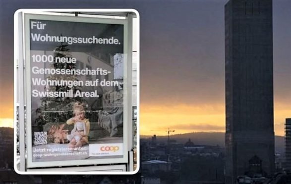 E gjitha tingëllon si një dhuratë dorëlirë për Krishtlindje: Strehim të përballueshëm në mes të qytetit të Cyrihut, transmeton albinfo.ch. Një poster që tregon një vajzë të vogël të ulur nën bredhin e Krishtlindjes lexon: “Për ata që kërkojnë një apartament. 1000 apartamente të reja të kooperativës (të subvencionuara) në faqen Swissmill”. Logoja e Coop mund të shihet poshtë djathtas, në poster.
