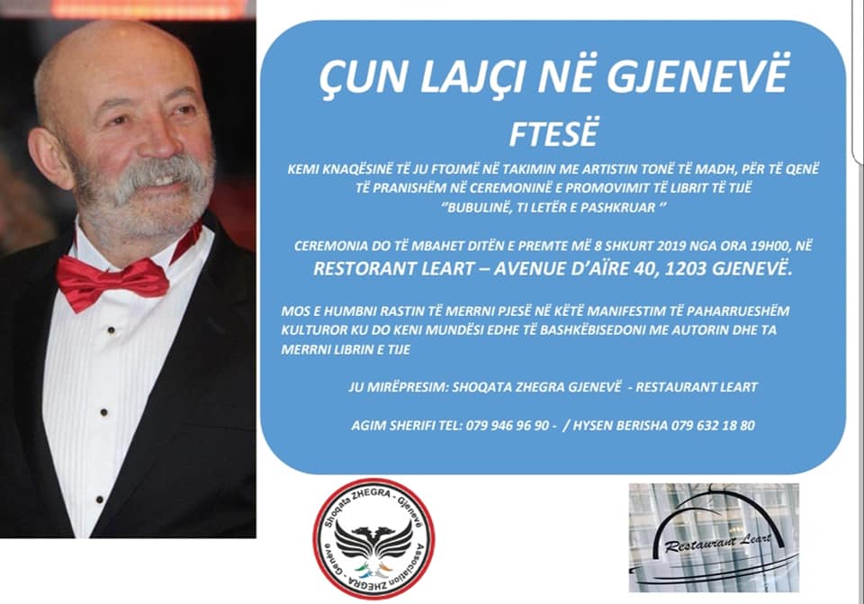 Shoqata Zhegra në Gjenevë ju fton të merrni pjesë në këtë manifestim kulturor, ku do të keni mundësi të bashkëbisedoni me autorin dhe ta merrni librin e tij.